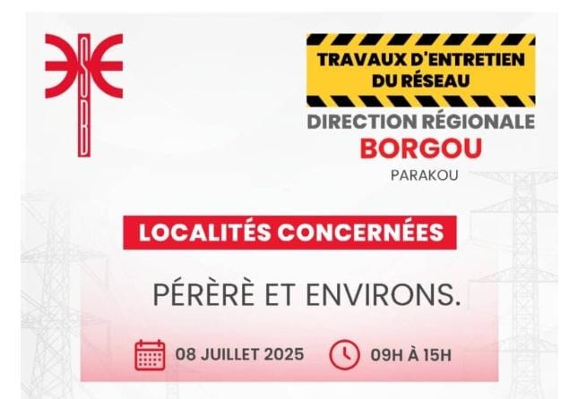 La Société Béninoise d’Énergie Électrique (SBEE) informe ses abonnés qu’elle procédera, le mardi 08 juillet 2025, à des interruptions temporaires de la fourniture d’électricité dans plusieurs localités du pays. Ces coupures sont liées à des travaux d’entretien du réseau et à l’exécution de projets techniques. L’annonce a été rendue publique via un communiqué officiel diffusé sur les canaux de la SBEE.