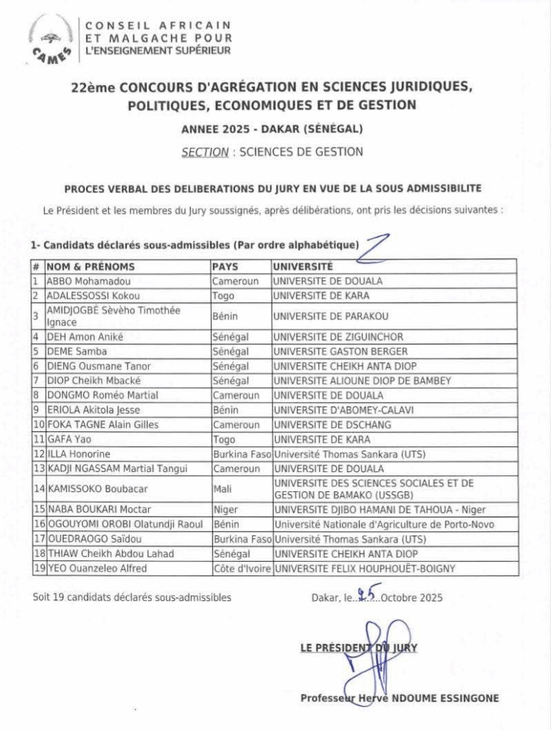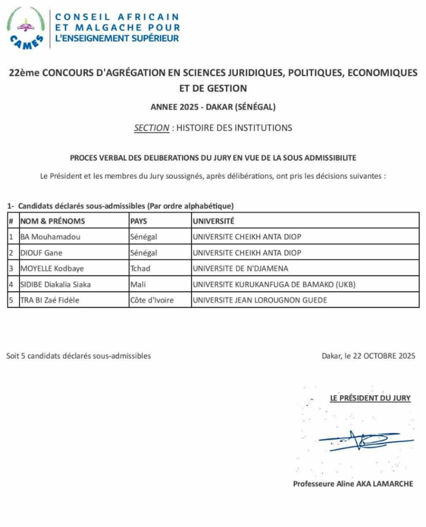 Le 22ᵉ Concours d’Agrégation des Sciences juridiques, politiques, économiques et de gestion du CAMES bat son plein depuis le 18 octobre 2025, dans les différents centres nationaux d’examen répartis à travers les pays membres. À mi-parcours, les résultats de sous-admissibilité des premières sections viennent d’être publiés, confirmant la montée en puissance du niveau académique au sein de l’espace universitaire francophone africain.