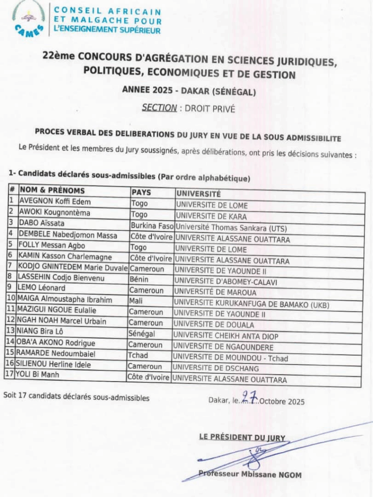 Le 22ᵉ Concours d’Agrégation des Sciences juridiques, politiques, économiques et de gestion du Conseil africain et malgache pour l’enseignement supérieur (CAMES) suit son cour normal. Les résultats de sous-admissibilité de la section Droit privé viennent d’être publiés, marquant une nouvelle étape décisive dans ce prestigieux concours universitaire qui se tient du 18 au 28 octobre 2025.