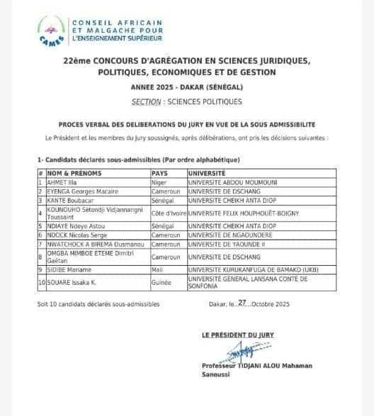 Le 22ᵉ Concours d’Agrégation des Sciences juridiques, politiques, économiques et de gestion du CAMES franchit une nouvelle étape. Après la section Droit privé, c’est au tour de la section Sciences politiques de livrer ses résultats de sous-admissibilité, confirmant la montée en puissance des travaux dans cette discipline stratégique pour les universités africaines.
