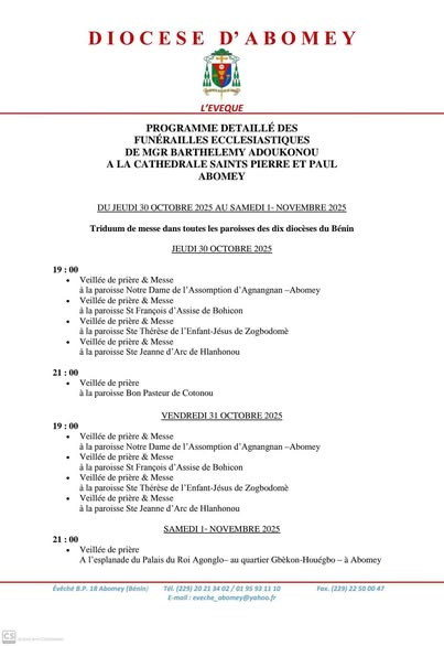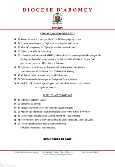 Selon le programme, un triduum de messes sera célébré du jeudi 30 octobre au samedi 1er novembre 2025dans toutes les paroisses des dix diocèses du Bénin, en hommage à la mémoire de ce grand serviteur de Dieu, figure marquante de l’Église béninoise et universelle. Il rejoindra sa dernière demeure le lundi 03 novembre 2025.
