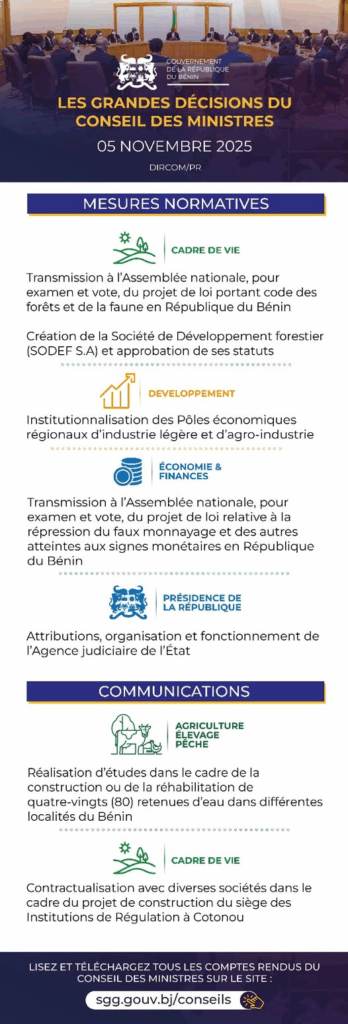 Le conseil des ministres s’est tenu ce mercredi 05 novembre 2025 sous la houlette du Président Patrice Talon. A cette occasion, plusieurs décisions et mesures ont été prises. En voici les grandes lignes en attendant l’intégralité du compte rendu du gouvernement.