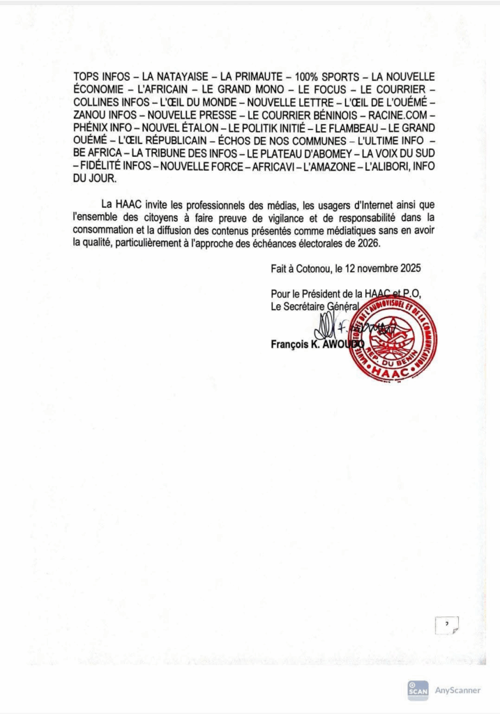 Selon la HAAC, plusieurs plateformes et pages anonymes se présentent abusivement comme des organes de presse sans disposer d’une existence légale. Ces entités, explique le communiqué, se livrent à des publications tendancieuses, relayant parfois des discours haineux et des informations non vérifiées. L’institution de régulation estime que ces pratiques constituent de graves violations des textes en vigueur et mettent directement en danger la crédibilité du paysage médiatique national, la sécurité, la cohésion sociale et le bon déroulement du processus électoral de 2026.