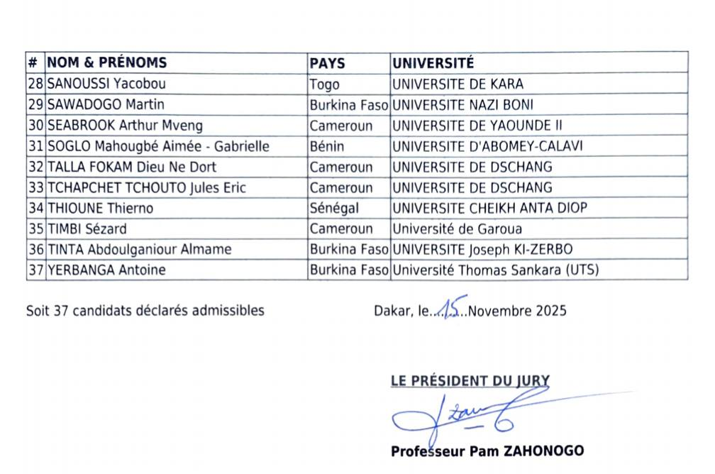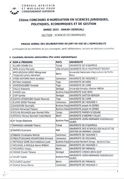 Les travaux du 22ᵉ Concours d’Agrégation des Sciences Juridiques, Politiques, Économiques et de Gestion du CAMES se poursuivent à l’Université Cheikh Anta Diop (UCAD) de Dakar, où se tiennent depuis le 10 novembre 2025 les deuxième et troisième épreuves décisives de cette prestigieuse compétition académique. Un moment stratégique pour les candidats, mais surtout pour les universités africaines qui attendent, avec ambition, de nouveaux maîtres de conférences agrégés. Après les résultats d’admissibilité pour la section Droit Public, ceux de la section Sciences Economiques ont été aussi dévoilés ce samedi 15 novembre 2025. Cinq béninois ont pu tirer leurs épingles du jeu et passer au tour suivant. Ci-dessous la liste.