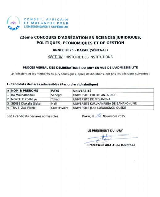 Les travaux du 22ᵉ Concours d’Agrégation des Sciences Juridiques, Politiques, Économiques et de Gestion du CAMES se poursuivent à l’Université Cheikh Anta Diop (UCAD) de Dakar, où se tiennent depuis le 10 novembre 2025 les deuxième et troisième épreuves décisives de cette prestigieuse compétition académique. Un moment stratégique pour les candidats, mais surtout pour les universités africaines qui attendent, avec ambition, de nouveaux maîtres de conférences agrégés. Après les résultats d’admissibilité pour la section 𝑺𝒄𝒊𝒆𝒏𝒄𝒆𝒔 𝑷𝒐𝒍𝒊𝒕𝒊𝒒𝒖𝒆𝒔, ceux de la section Histoire des Institutions  ont été aussi dévoilés ce mardi 18 novembre 2025. Ci-dessous la liste.