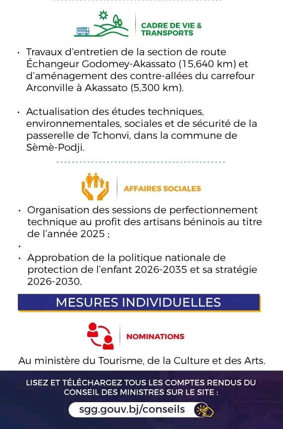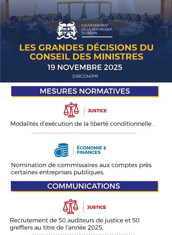 Le conseil des ministres s’est tenu ce mercredi 19 Novembre 2025 sous la houlette du Président Patrice Talon. A cette occasion, plusieurs décisions et mesures ont été prises. En voici les grandes lignes en attendant l’intégralité du compte rendu du gouvernement.