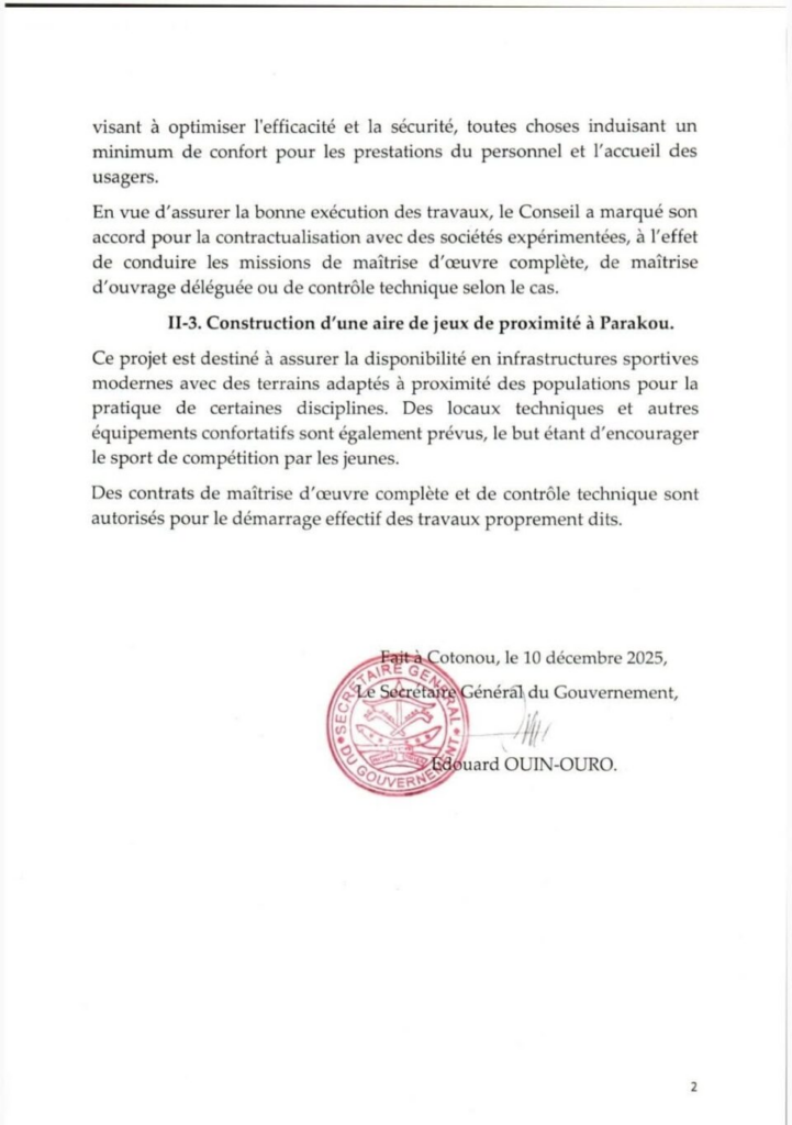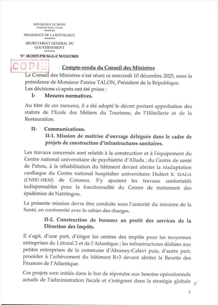 Le conseil des ministres s’est tenu ce mercredi 10 décembre 2025 sous la houlette du Président Patrice Talon. A cette occasion, plusieurs décisions et mesures ont été prises. Voici l’intégralité du compte rendu.