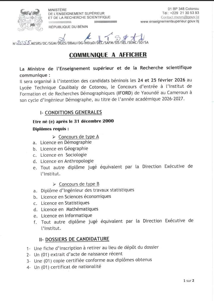 Le ministère de l’Enseignement supérieur et de la Recherche scientifique a annoncé l’organisation du concours d’entrée à l’Institut de Formation et de Recherches Démographiques (IFORD) de Yaoundé, au titre de l’année académique 2026-2027. Destiné aux candidats béninois, ce concours se déroulera les 24 et 25 février 2026 au Lycée technique Coulibaly de Cotonou.