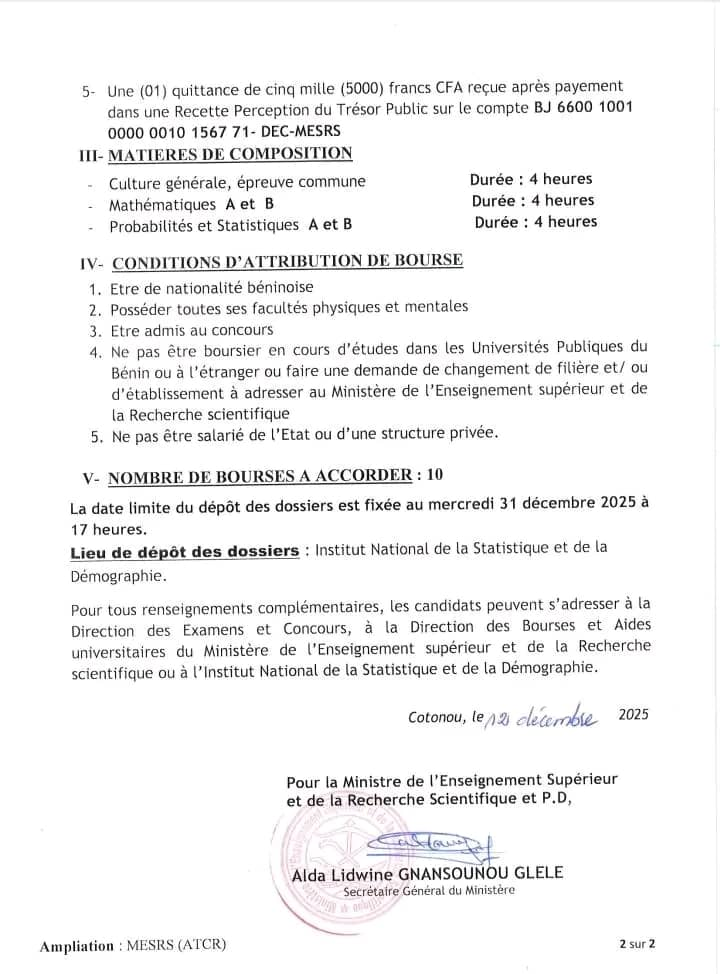 Les dossiers doivent être déposés à l’Institut national de la statistique et de la démographie (INStaD), au plus tard le mercredi 31 décembre 2025 à 17 heures.