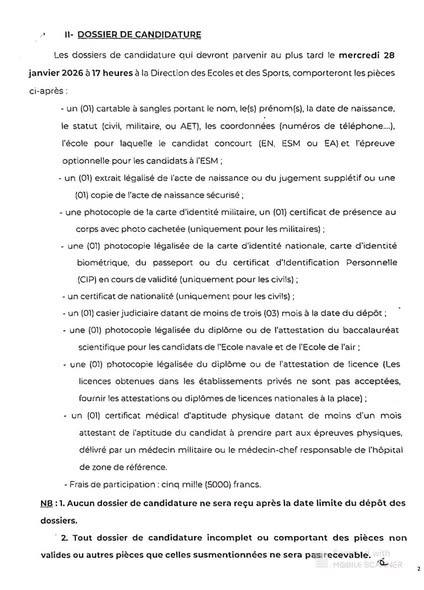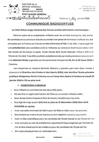 Le concours est ouvert aussi bien aux candidats civils qu’aux militaires béninois, remplissant les conditions exigées. Il s’agit d’une opportunité rare pour les jeunes désireux de bâtir une carrière d’officier au sein des Forces armées béninoises, avec une formation de haut niveau à l’international.