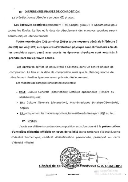 Le Chef d’État-major général des Forces armées béninoises (FAB) annonce l’ouverture d’un concours exceptionnel dans le cadre de la coopération militaire entre le Bénin et la France. Des places de formation d’officier ont été octroyées aux FAB pour l’accès à trois prestigieuses écoles militaires françaises dont l’École navale (EN), l’École spéciale militaire de Saint-Cyr (ESM) et l’École de l’Air (EA).