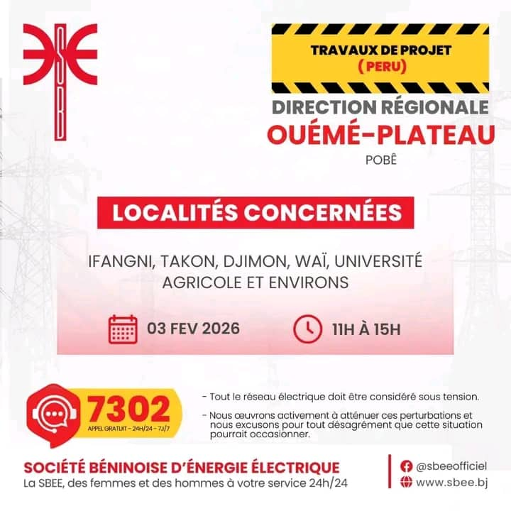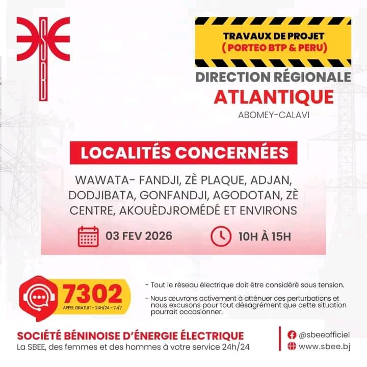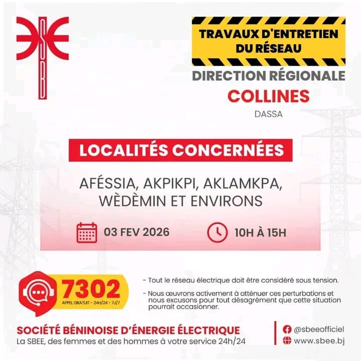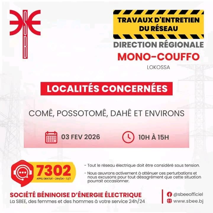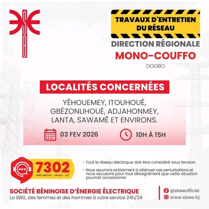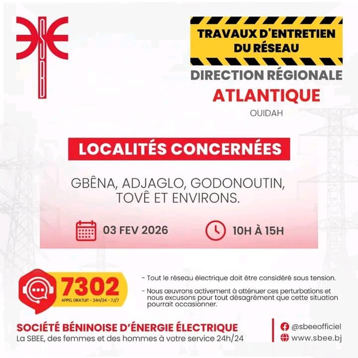 Dans le cadre de l’amélioration continue de la qualité de service, la SBEE, en collaboration avec ses partenaires, procédera à des travaux de maintenance le mardi 03 février 2026. L’annonce a été faite par la SBEE via ses canaux digitaux dont sa page Facebook. Ces interventions techniques, indispensables à la fiabilité du réseau électrique selon la SBEE, pourraient entraîner des perturbations temporaires de la fourniture d’électricité dans certaines zones. Ci-dessous les zones concernées
